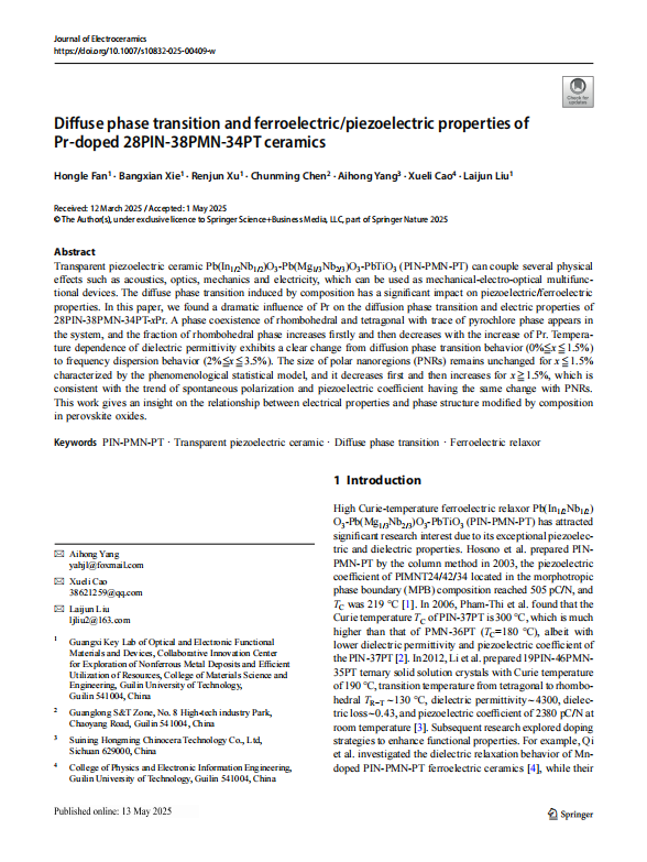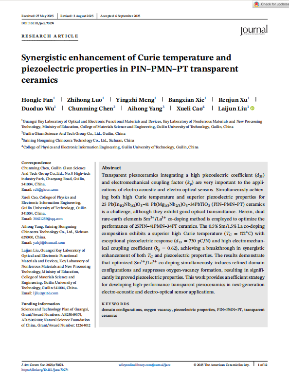 项目描述:本项目面向新一代光通信对高性能电光开关的迫切需求,致力于攻克传统压电陶瓷不透明与电光性能协同优化的技术瓶颈。通过引入稀土离子选择性掺杂技术,精准调控晶界相组分与结构,在实现材料可见光区高透光率的同时,协同优化了其压电常数。基于材料突破,建立了电场诱导双折射效应的量化模型,成功指导了低半波电压电光开关调制单元的设计,形成了从材料设计、工艺优化到器件集成的全链条解决方案。