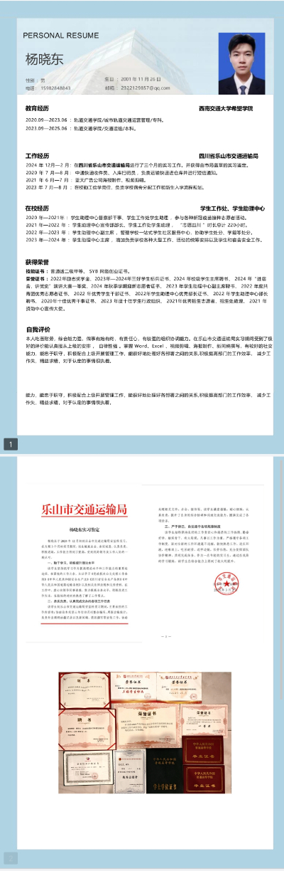 本人吃苦耐劳,综合能力强,做事有始有终,有责任心,有较强的组织协调能力。在乐山市交通运输局实习期间受到了极好的评价能认真服从上级的安排,自律性强。掌握Word、Excel、视频剪辑、海报制作、新闻稿撰写,大学期间担任了四年学生干部,有较好的社交能力,能忠于职守,积极配合上级开展管理工作,能很好地处理好各部署之间的关系,积极提高部门的工作效率,减少工作失,精益求精,对于认定的事情很执着。